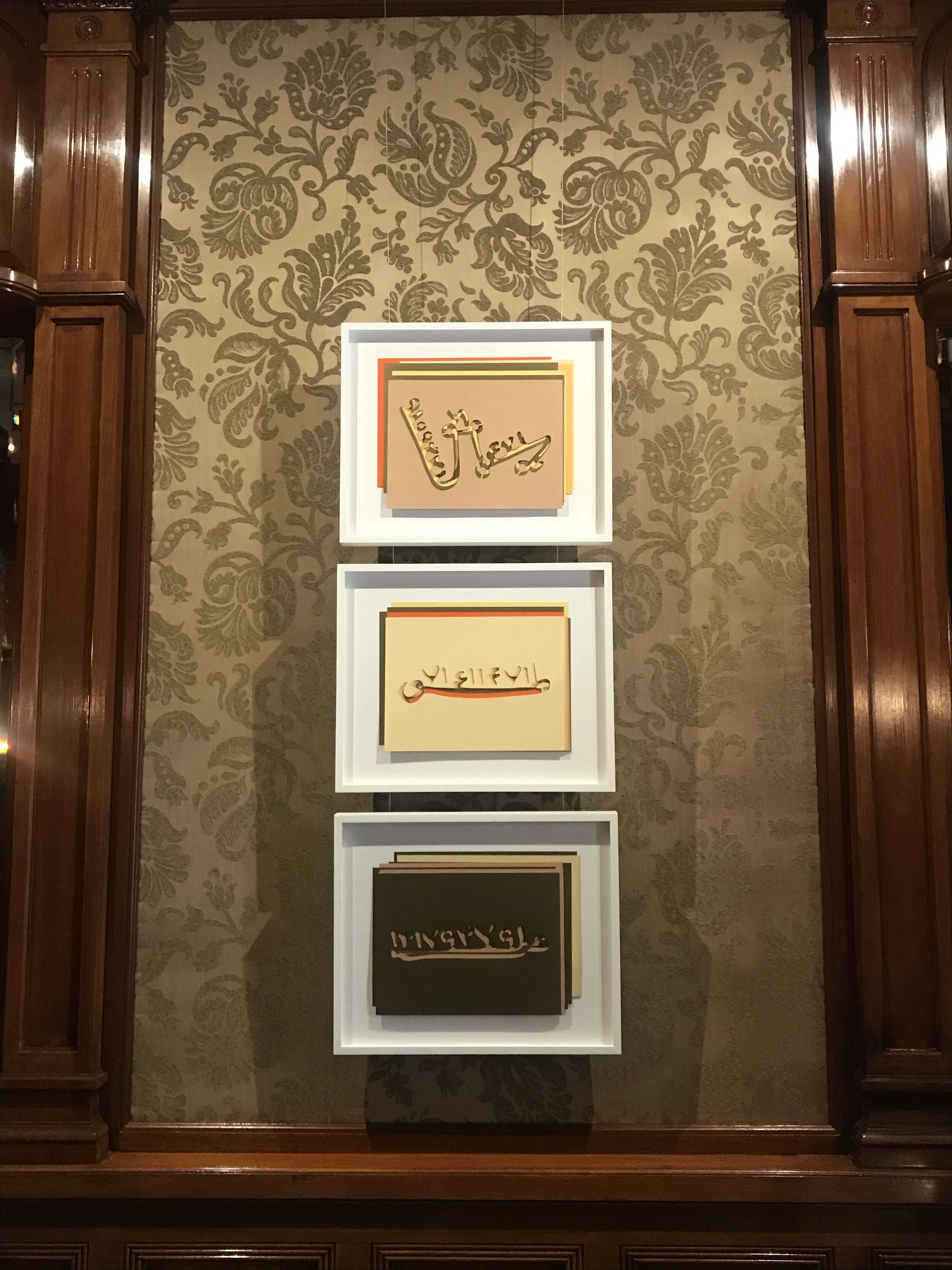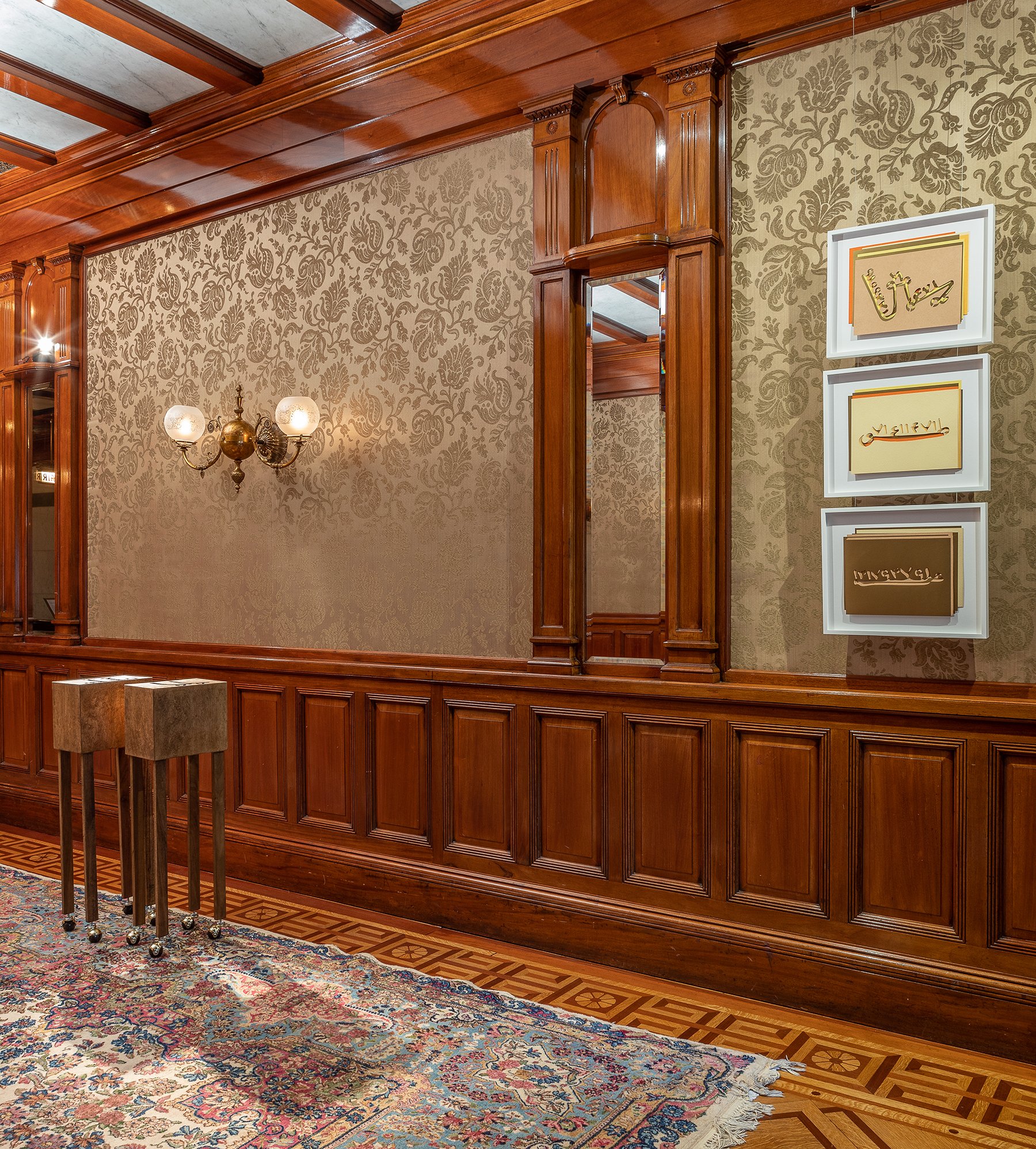 The final work in the exhibition is a small calligraphed text. It is the only work that contains multiple words. To create it, Taghavi commissioned calligrapher Parisa Shafiei to etch an excerpt from a poem [Ghazal #551] by the 13th-century poet Saadi Shīrāzī in a style of calligraphy that is purposefully devoid of noghte(s). Without them, the reader needs to slow down to access the meaning of the text. The poem reflects on the state of longing and the persistence of a beloved’s memory. Elsewhere in the exhibition the noghte refracts through a prism or floats in a painting, separated from the context of letters. Yet here, in Taghavi’s final work, readers experience the inverse: the pure context of letterforms devoid of the noghte(s) that provide their discerning sounds.